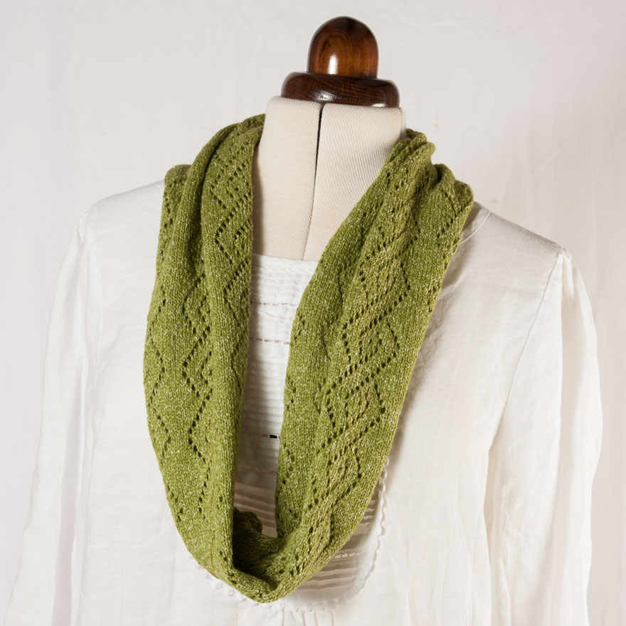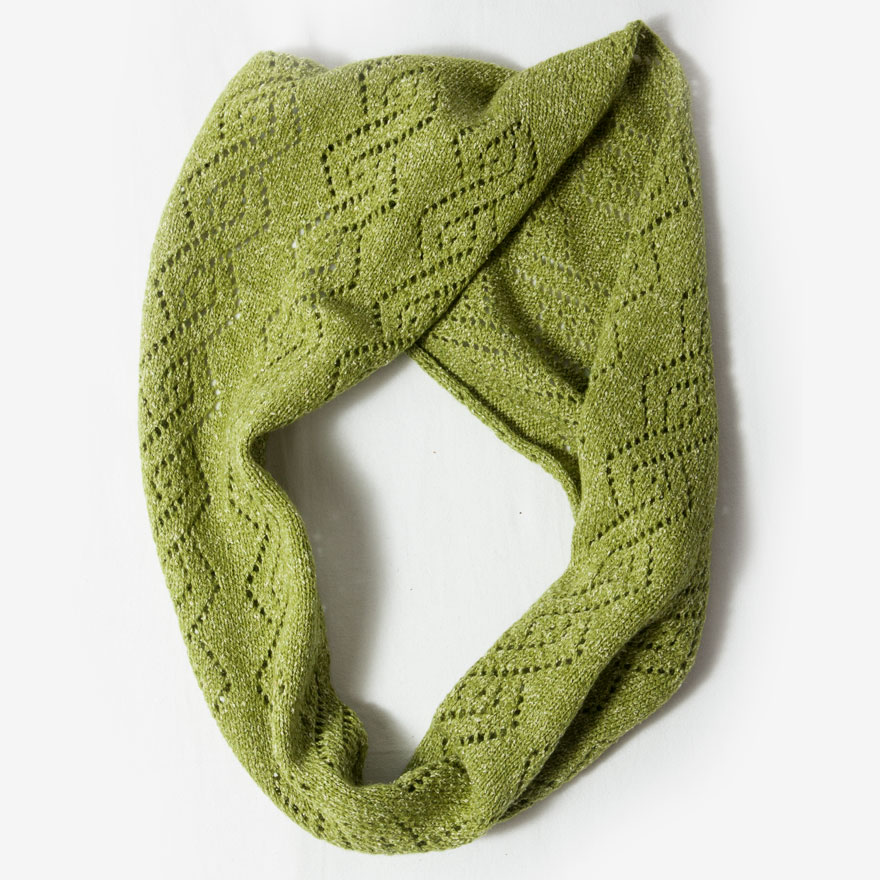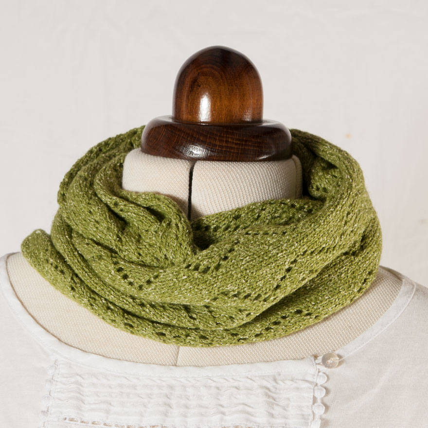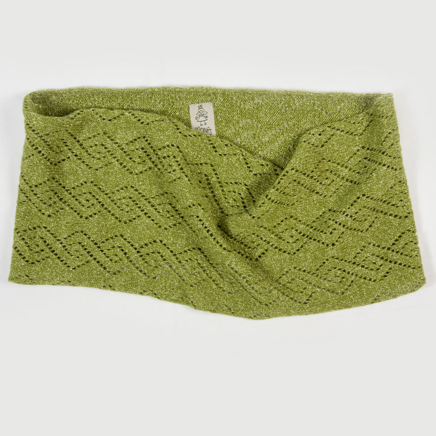Dejlig blød halsedisse i græsgrøn uld/silke garn. Halsedissen er i lace-strik og er et “lukket” halstørklæde.